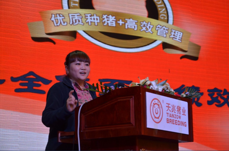 下午,天兆豬業動保部總經理張任娜女士向大家分享了與生物安全有關的《與生物安全相結合的現場績效考核制度和實施》的發言。并以如何讓豬場全員理解生物安全、遵守生物安全及確保生物安全措施執行到位向與會人員分享天兆的經驗。