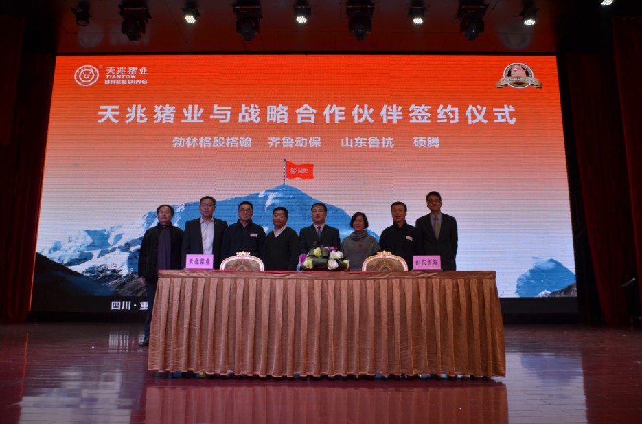 最后,天兆豬業與勃林格、齊魯動保、山東魯抗、碩騰召開了戰略合作伙伴簽約儀式,并認為他們在生物安全上給予了天兆豬業極大的幫助,是天兆值得信任的友好合作伙伴。