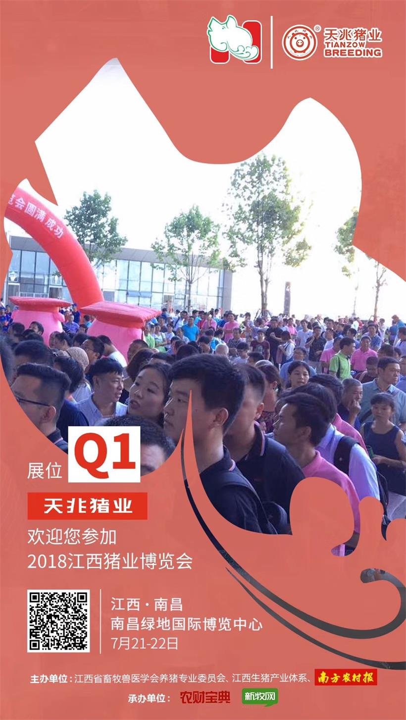 7月21日—22日,由江西省畜牧獸醫學會養豬專業委員會、江西生豬產業體系、南方農村報社的“2018江西豬業展覽會”將在江西省南昌市:南昌綠地國際博覽中心盛大舉行。本次展會天兆豬業將全程參展,我們將以優質的產品和熱情的服務期待您的蒞臨!
