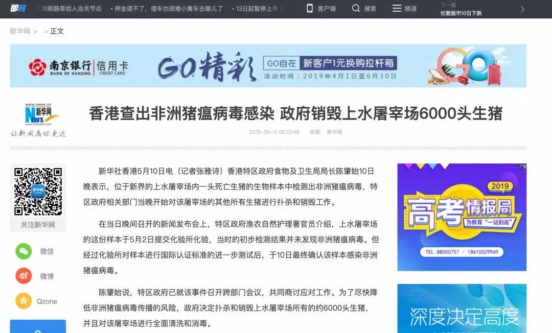 5月10日晚,香港特區政府食物及衛生局局長陳肇始表示,位于新界的上水屠宰場內一頭死亡生豬的生物樣本中檢測出非洲豬瘟病毒。至此,全國除了澳門、臺灣之外的32個省、市、自治區已經全部發現非洲豬瘟疫情。