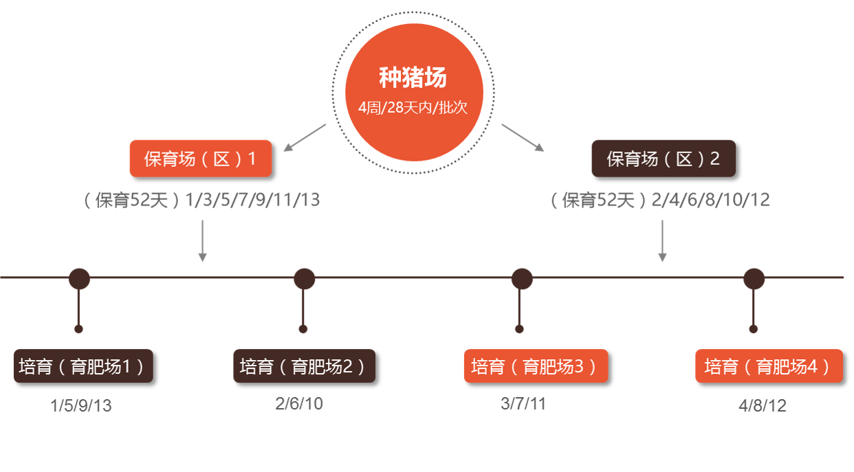 同時,為了適應此“多點式生產模式的需要,天兆豬業調整了生產的節律,實行“28天”分批次生產模式。每隔28天就會有一批母豬進行配種,一批小豬出生,出生的小豬一般在21日齡斷奶,斷奶后的小豬與母豬都會全部運出產仔舍,接下來的1周時間對產仔舍進行清洗、消毒與烘干,隨之下一批待產母豬進入產仔舍產仔。