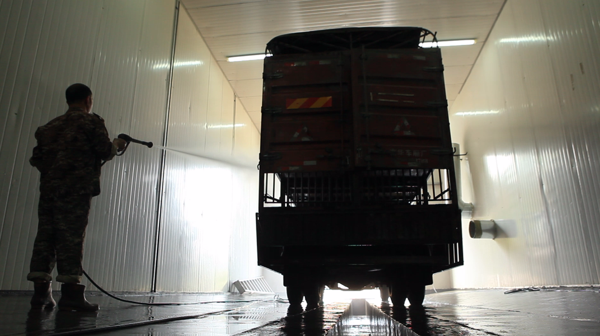 其次,在物流環節上,加強對豬只運輸車輛的管理。建立洗消中心和中轉站,專車專用,嚴格執行各項清洗程序和制度。例如,運豬車輛在運豬前需前往規定的洗消中心進行清洗消毒,經檢查合格后攜洗消合格單才可至豬場運豬。轉豬后立即清洗——干燥——消毒,經過一晚或者兩晚的隔離,才能再次進行運輸。