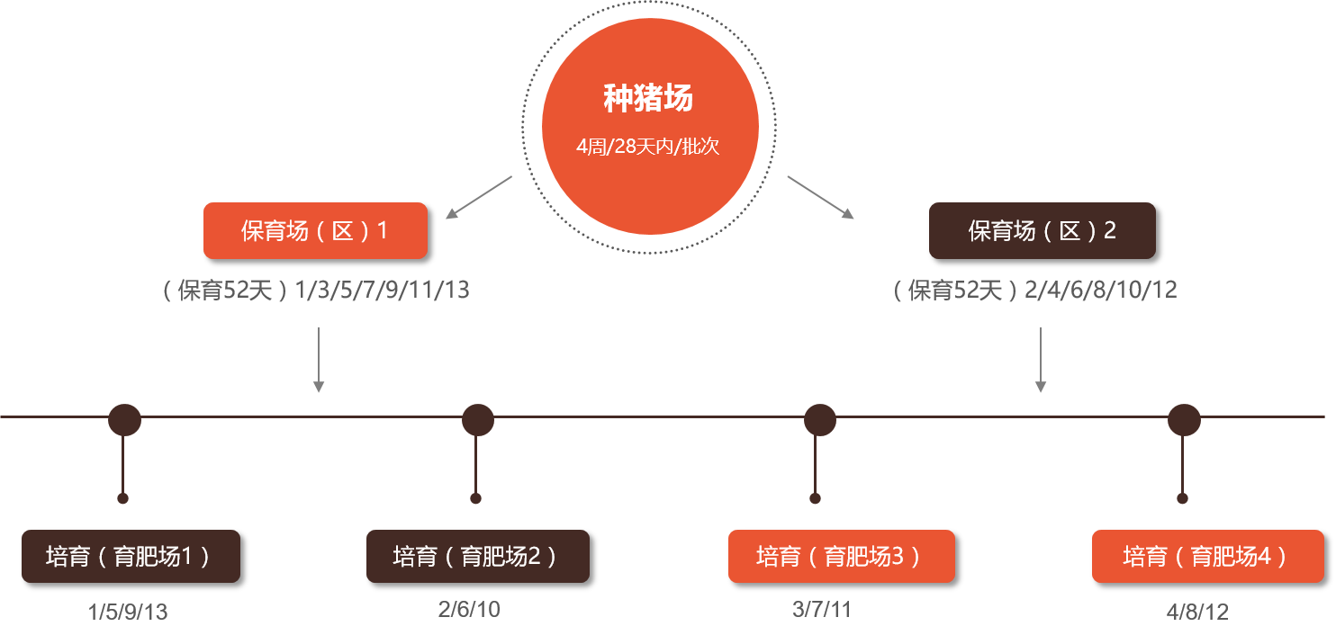 此外,SEW的多點式生產(chǎn)模式還要求豬場做到批次化生產(chǎn)。批次化生產(chǎn)就是將原來每天或每周都有的斷奶、配種及分娩工作,改為在集中的時間內(nèi)完成,且間隔分明有規(guī)則。這樣的方式可以在一定程度上阻斷傳統(tǒng)連續(xù)飼養(yǎng)方式造成的疫病傳播,降低養(yǎng)豬的生物安全風險。