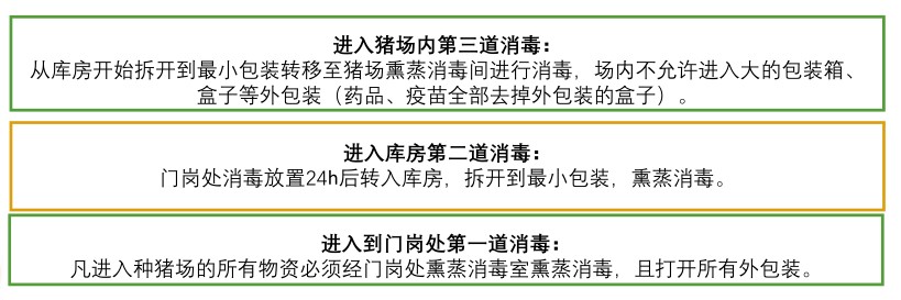 豬場是一個相對封閉的環境,其人員流動、內外物資的轉運,會帶來病原微生物的內外轉移,造成相應的生物安全隱患。因此,天兆豬業旗下豬場對物資均采取集中采購—集中配送的方式,減少物資進出豬場的頻率。此外,所有物資(包括藥品、疫苗、勞保物資、維修物資、廚房物資等)進入豬場前均要通過三道消毒防線。