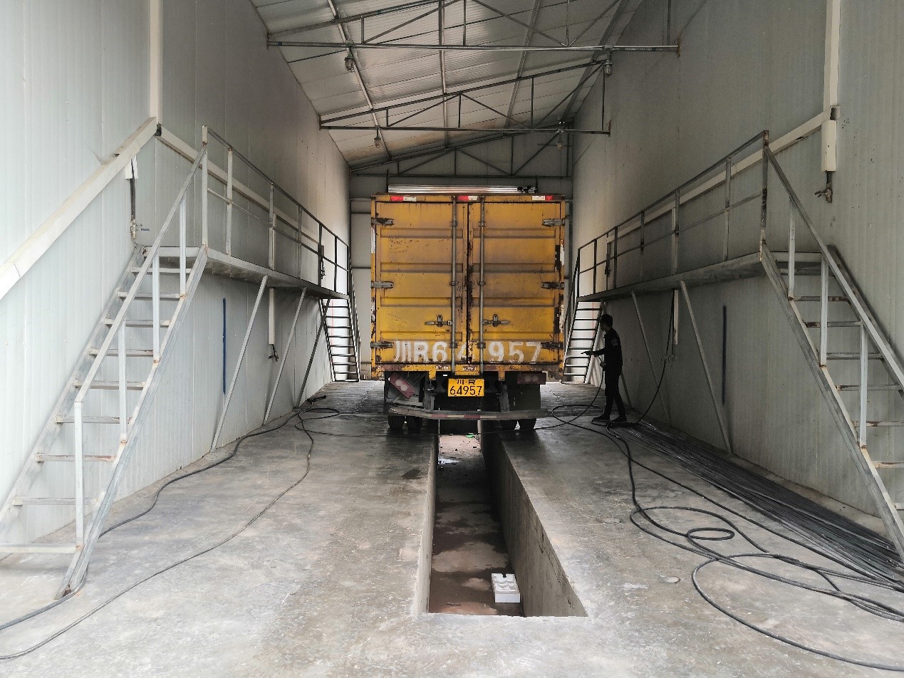 在到達指點地點后,需再次進行非洲豬瘟檢測,如果為陽性,則對問題車輛進行勸返,如果為陰性,則要到天兆豬業設置的洗消中心內,再次進行清洗消毒烘干和非洲豬瘟檢測,檢測結果為陰性,該外部運豬車才能裝豬。三次清洗消毒、三次高溫烘干、三次非洲豬瘟檢測,保證銷售車輛的安全。