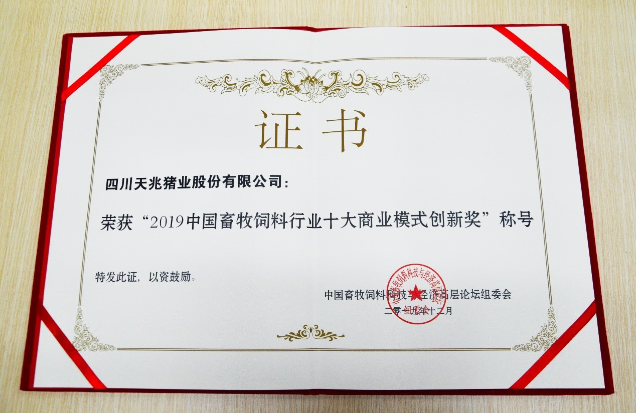點贊!天兆豬業榮獲2019中國畜牧飼料行業十大商業模式創新獎